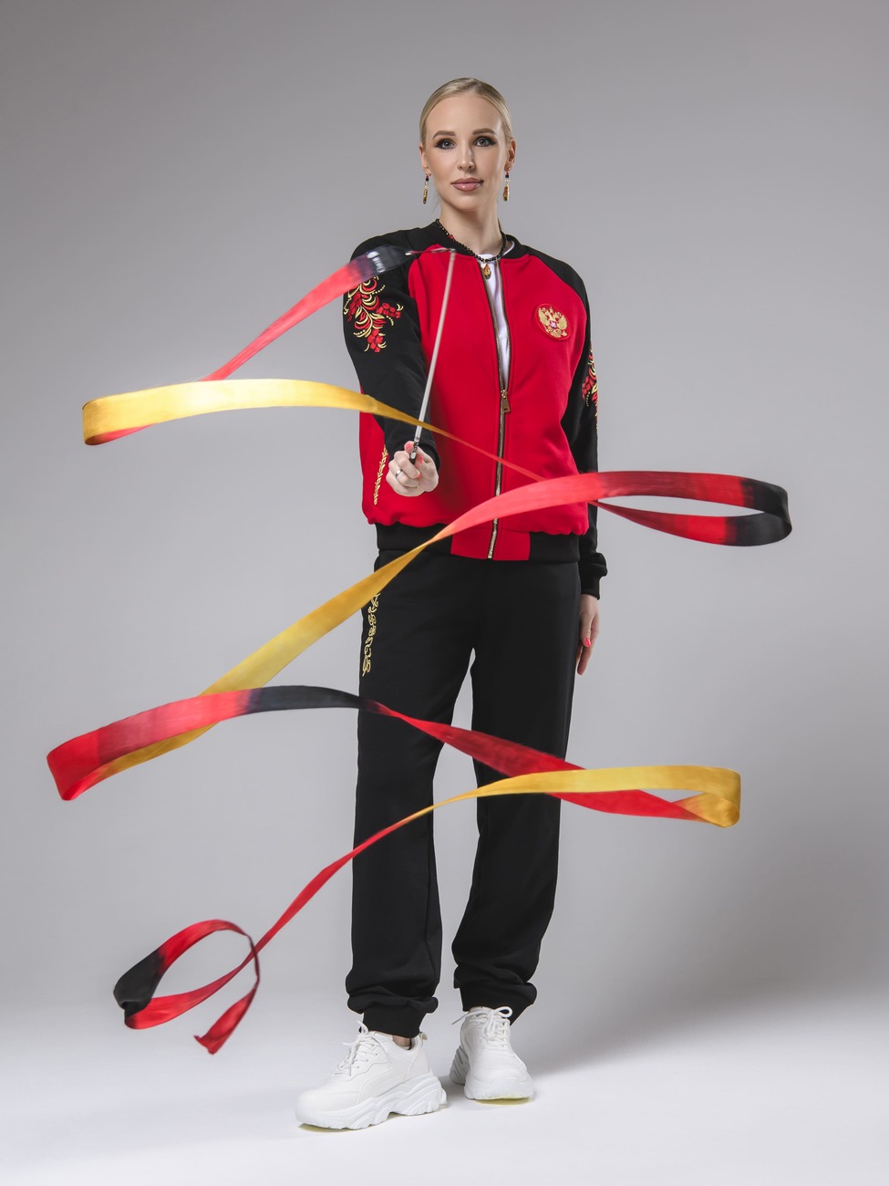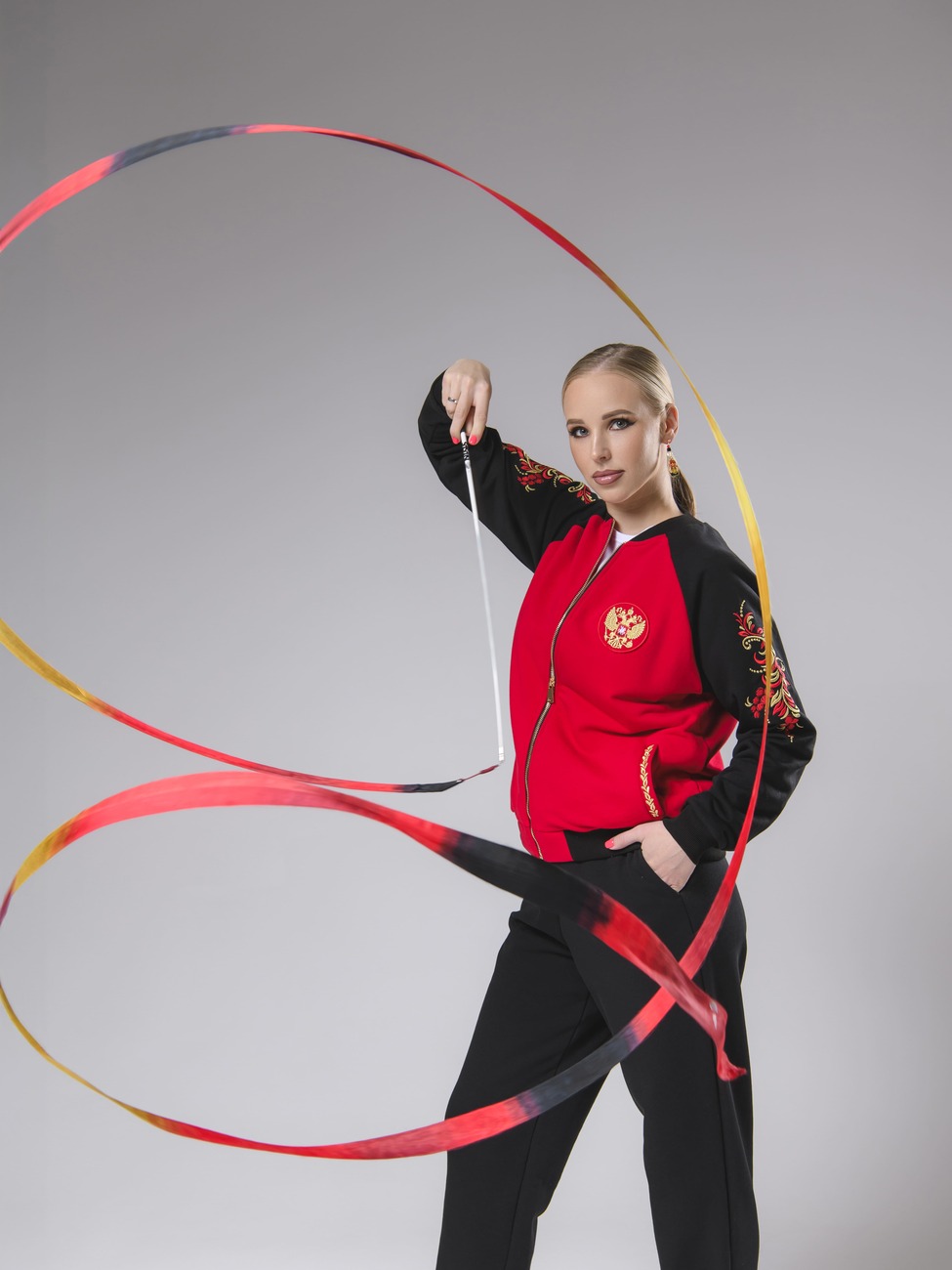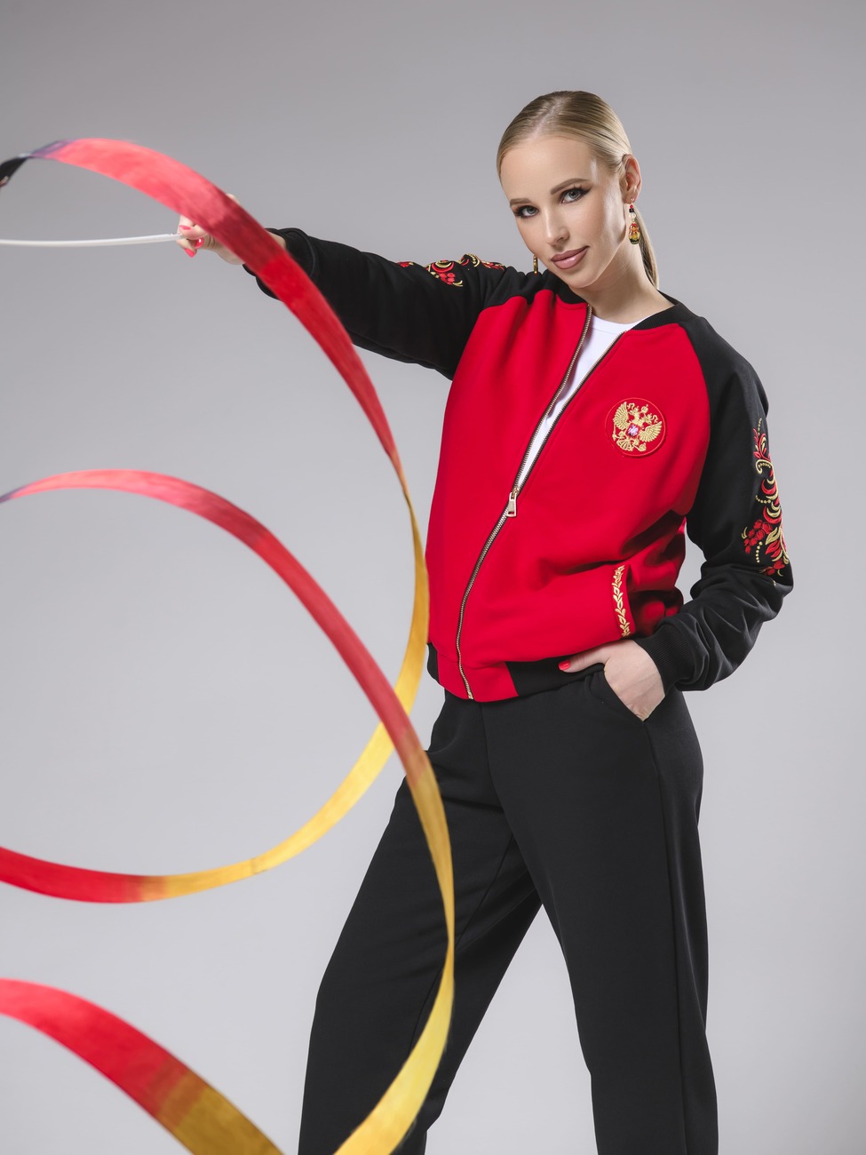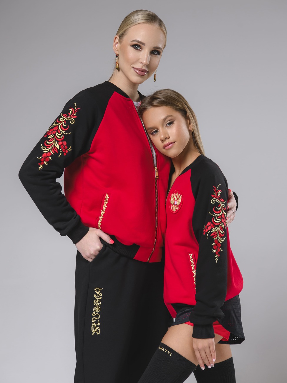 Бомбер для девушек из красного футера трехнитка петля прямого силуэта, на молнии, с черными воротником, манжетами и поясом из кашкорсе, прорезными караманами с листочкой и длинными черными рукавами реглан, на полном подкладе из красной кулирной глади. Рукава декорированы вышивкой красно-золотого цветочно-ягодного узора на плече, на полочке слева расположен красный шеврон с вышивкой Герба Российской Федерации золотого цвета, на листочке с обеих сторон вышивка иммитация веточки золотого цвета, на спине надпись-вышивка Russia золотого цвета.