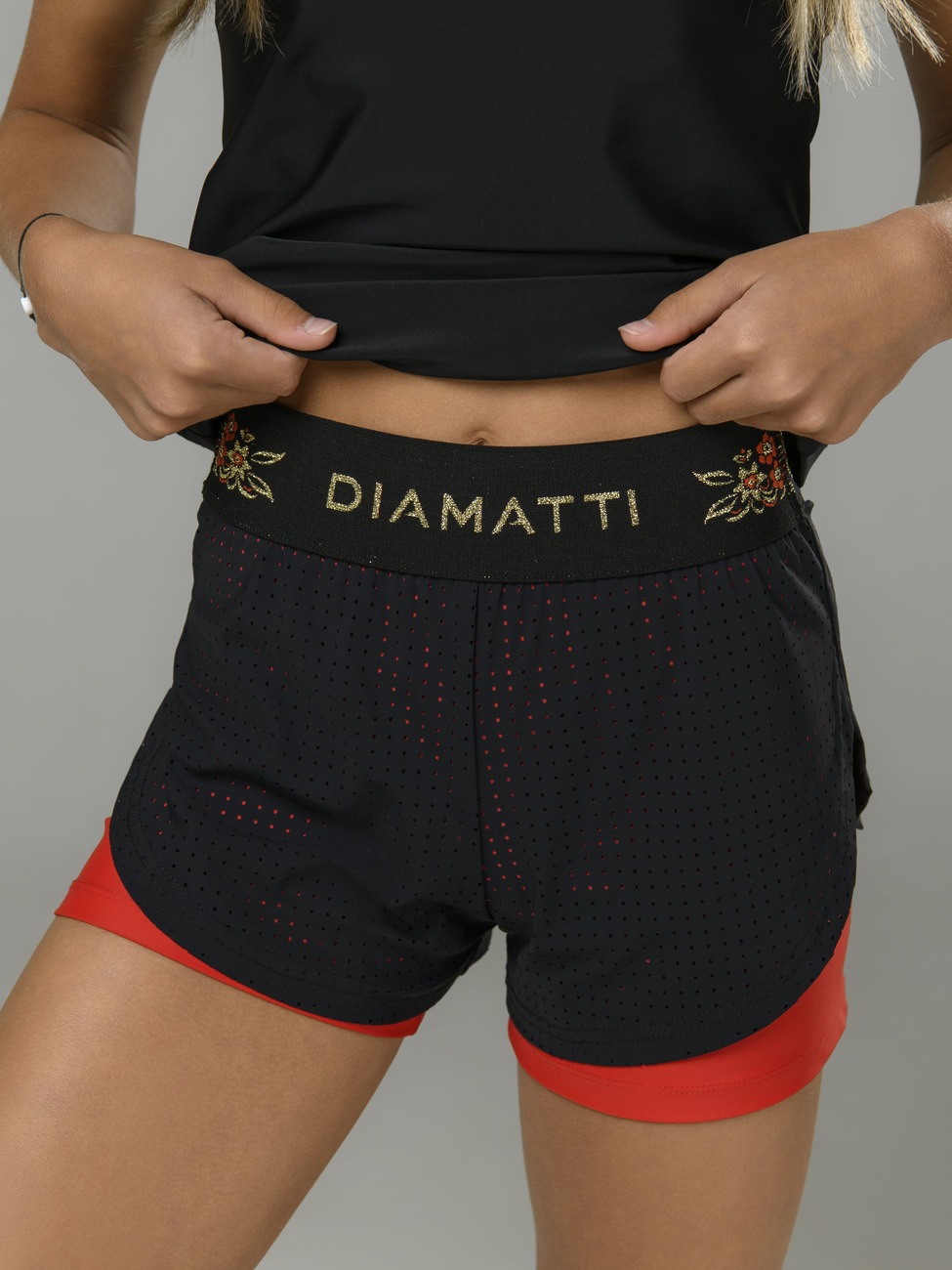 Шорты для девочек двойные с поясом на резинке. Верхние шорты выполнены из черного перфорированного бифлекса, нижние - из красного бифлекса. Резинка черная сборная: вышивка красно-золотой цветочный узо сзади и сбоку и DIAMATTI золотом спереди, с бархатной прострочкой внутренней стороны.
