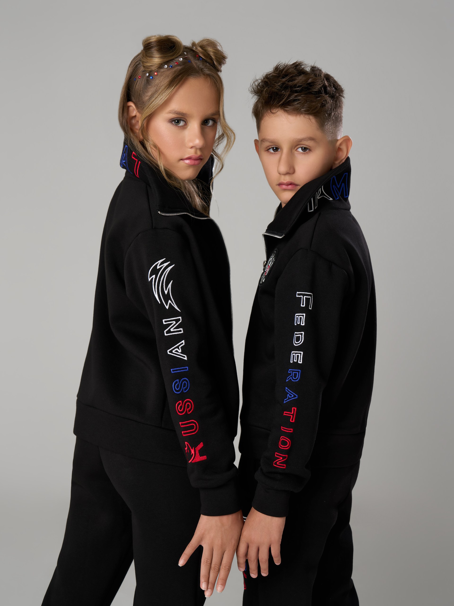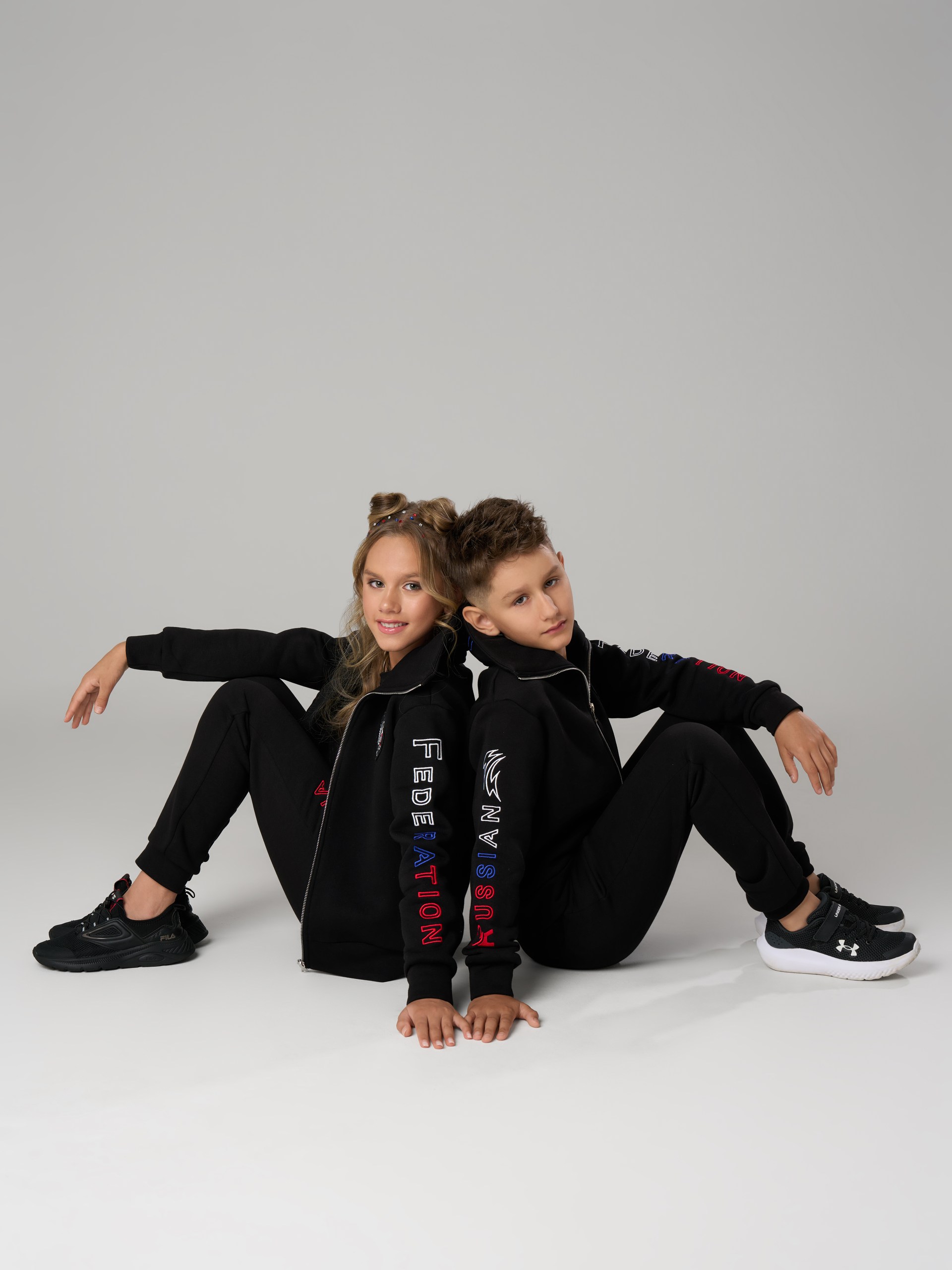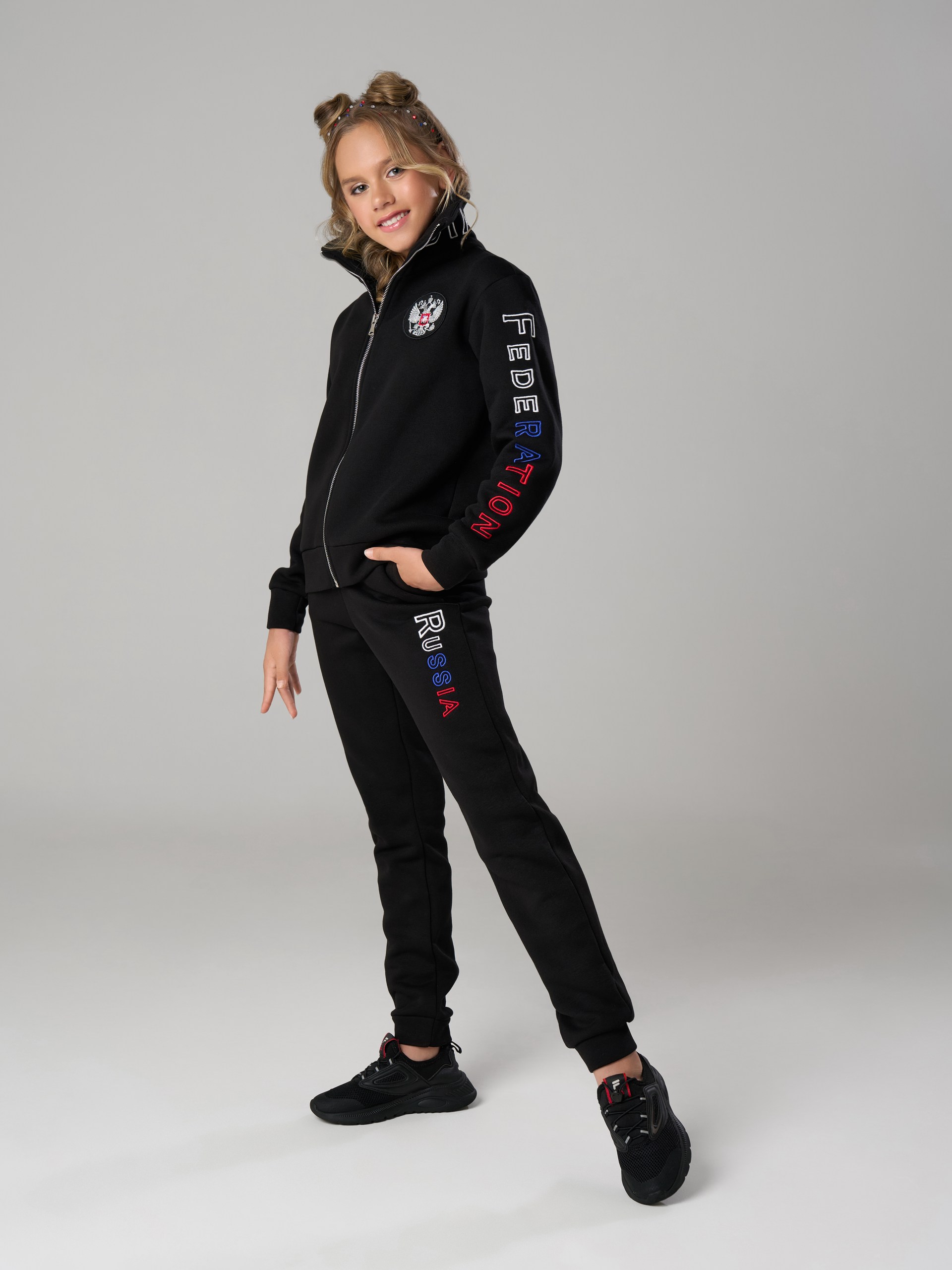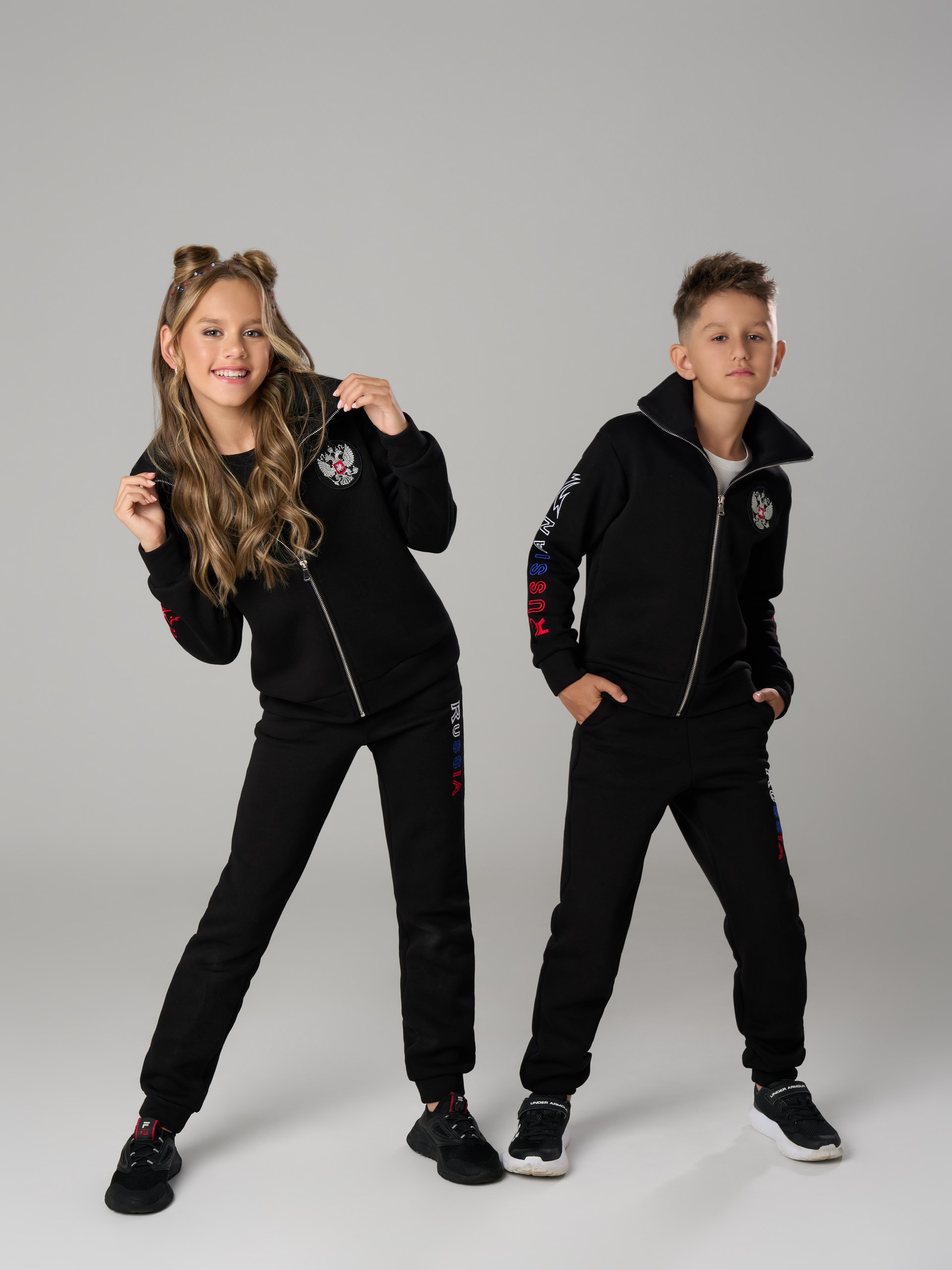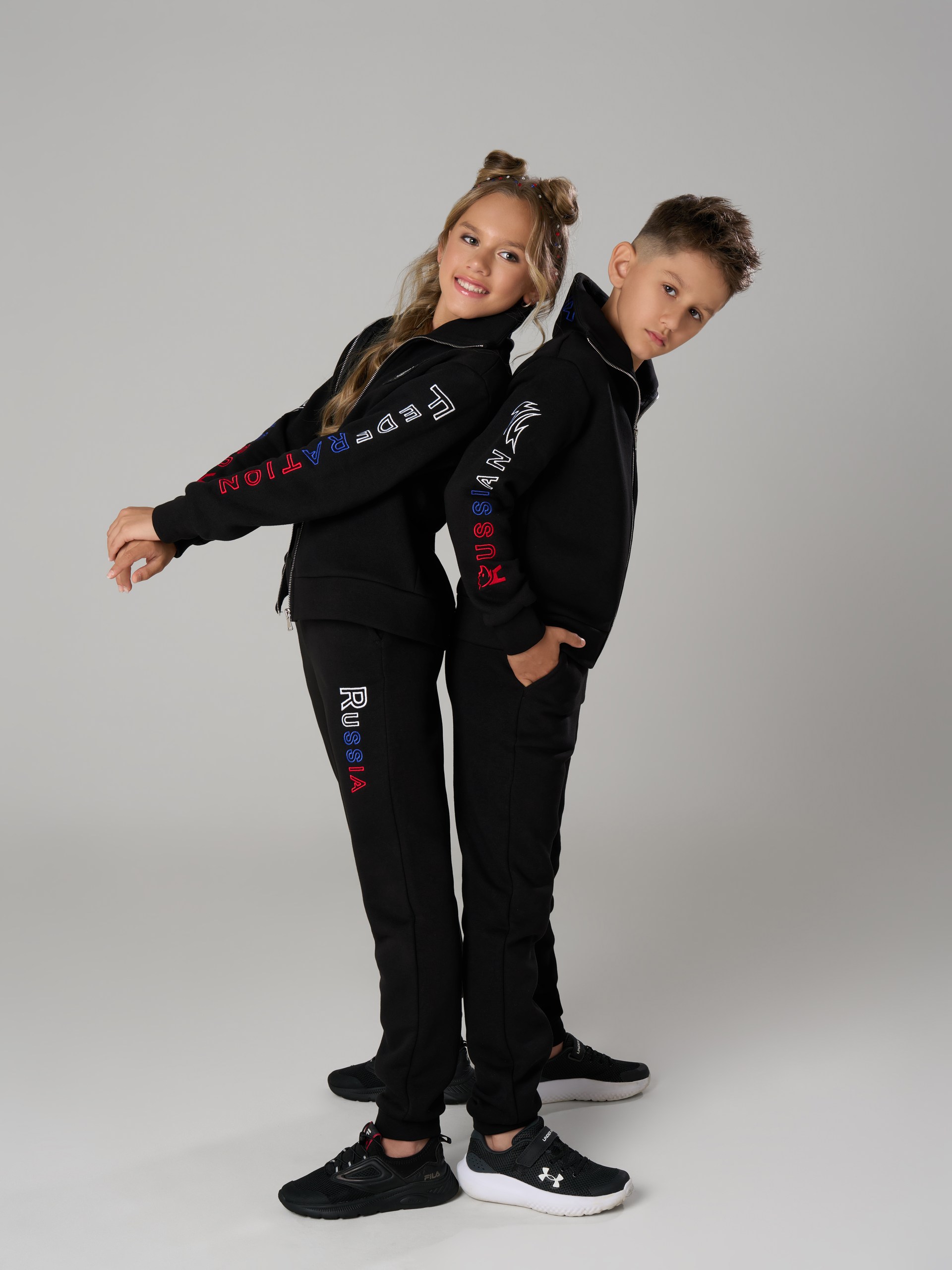 Брюки-джоггеры универсальные DIAMATTI RF BLACK из футера с начесом, с карманами и манжетами из основной ткани, пояс на резинке из кашкорсе, на левом бедре 3D вышивка "RUSSIA" в цвете триколор.
