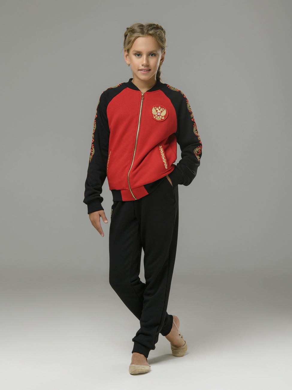 Брюки-джоггеры для девочек из черного футера трехнитка петля классические с карманами, пояс и манжеты из кашкорсе, в поясе внутренняя резинка. На правом бедре сверху вдоль шва расположена надпись-вышивка Russia золотого цвета.