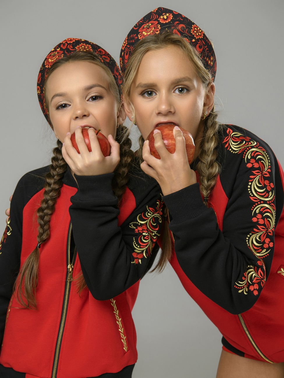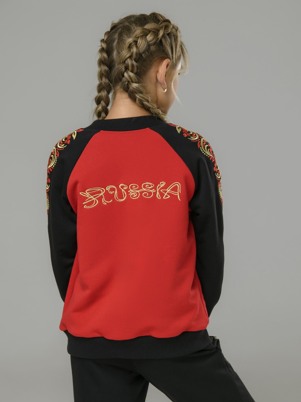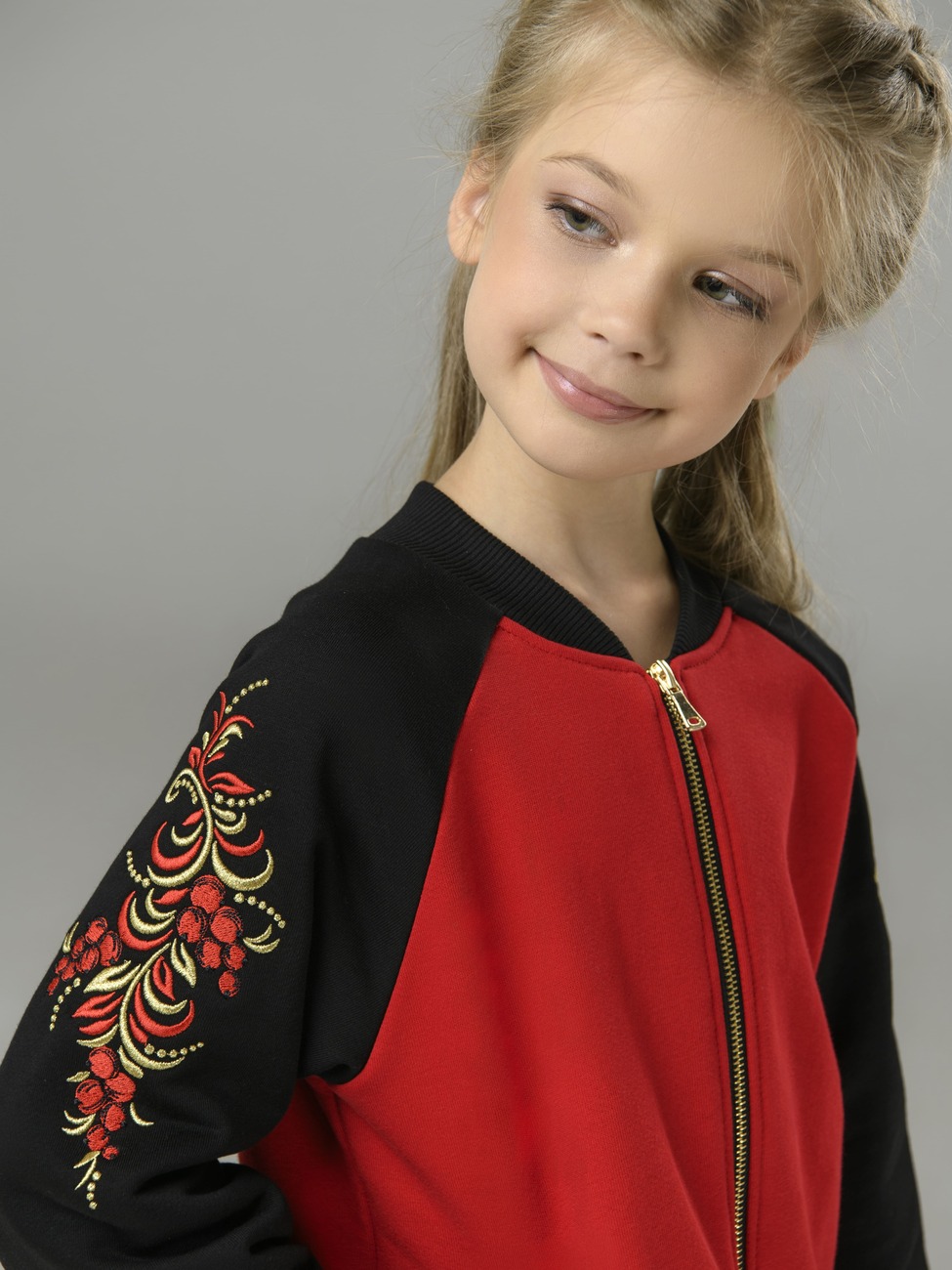 Бомбер для девочек из красного футера трехнитка петля прямого силуэта, на молнии, с черными воротником, манжетами и поясом из кашкорсе, прорезными караманами с листочкой и длинными черными рукавами реглан, на полном подкладе из красной кулирной глади. Рукава декорированы вышивкой красно-золотого цветочно-ягодного узора на плече, на полочке слева расположен красный шеврон с вышивкой Герба Российской Федерации золотого цвета, на листочке с обеих сторон вышивка иммитация веточки золотого цвета, на спине надпись-вышивка Russia золотого цвета.